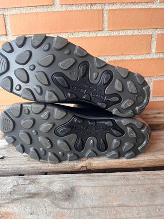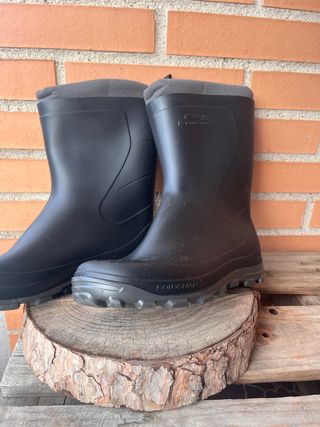 Botas de agua de la marca Solocnac, compradas en Decathlon. Son negras y de caña alta. - Material exterior de goma. - Forro interior textil. - Suela de goma con buen agarre. Con forro polar extraíble y lavable ayuda a mantener los pies abrigados y el botín de PVC los mantiene secos. Ideal para salidas al aire libre cuando el clima es frío y lluvioso. Muy poco uso