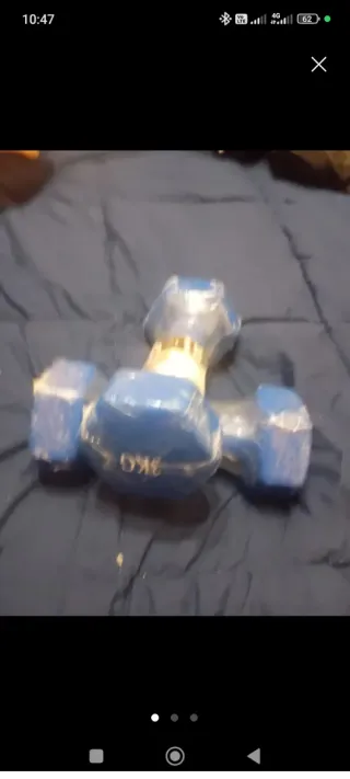 Par de mancuernas de vinilo en color azul. Cada una pesa 3kg. - Revestimiento de vinilo. - Peso: 3kg cada una.