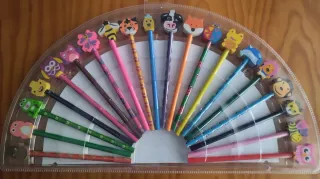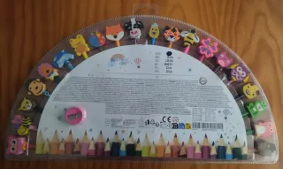 Conjunto de 20 lápices de colores con divertidos diseños de animales en la parte superior, cada uno con una goma de borrar. Entrega en Parla. - Incluye 20 lápices. - Cada lápiz tiene una goma de borrar con forma de animal. - Diseños variados de animales.