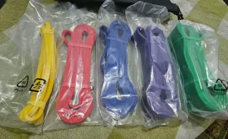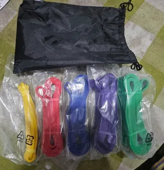 Pack de bandas elásticas para entrenamiento de fuerza y resistencia. Incluye una bolsa de transporte. - Bandas de diferentes resistencias. - Colores: amarillo, rojo, azul, morado y verde. - Material: látex.