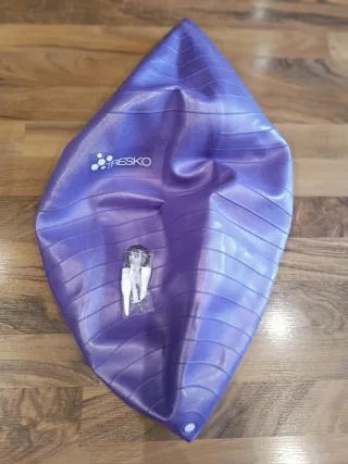 Pelota de pilates de color morado, ideal para ejercicios de tonificación y equilibrio. Marca TRESKO. - Textura con líneas para un mejor agarre. - Diseño inflable.