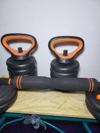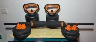Juego de pesas ajustables para entrenar en casa o el gimnasio. Permiten variar el peso según el ejercicio. - Barras metálicas. - Discos de peso. - Cierres de seguridad.