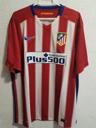 Camiseta de fútbol del Atlético de Madrid de la temporada 2015-16. - Diseño a rayas rojas y blancas. - Logo de Nike y escudo del club. - Patrocinador principal Plus500.