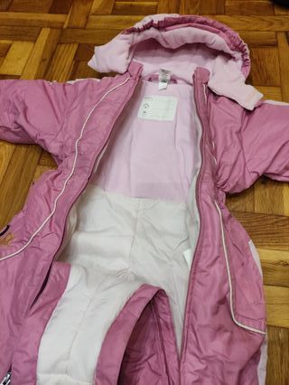 Mono de esquí rosa para bebé, ideal para mantener a los más pequeños abrigados y protegidos. - Color rosa con detalles blancos. - Capucha forrada. - Cremalleras frontales. - Cintura elástica.