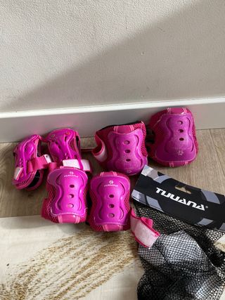 Set de protecciones infantiles en color rosa, ideal para patinaje. Tienen marcas de uso pero se pueden seguir usando. - Incluye rodilleras, coderas y muñequeras. - Cierre con velcro ajustable. - Marca: Tijuana. - Edad: 4-6 años.