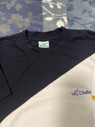 Camiseta deportiva de manga corta con diseño bicolor. - Color principal azul marino y blanco. - Logo de La Salle bordado. - Detalle de ribete amarillo en manga.