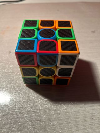 Cubo de Rubik 3x3 con un diseño moderno y acabado en fibra de carbono. - Superficie con patrón de fibra de carbono. - Bordes de colores vivos. - Vendo solo en Valencia
