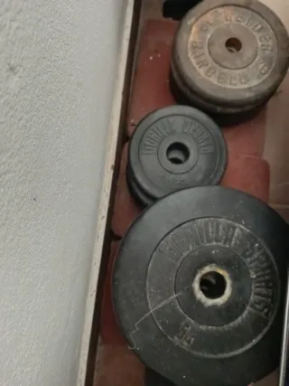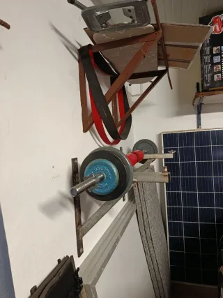 Conjunto de equipamiento para gimnasio en casa. 2 mancuernas,1 barra press , 12 discos de 5 kilos , 8 discos de 2,5 kilos, banco de ejercicios press banca y reclinable,elásticos,soporte de pared para hacer sentadillas,soporte para hacer dominadas, bicicleta elíptica. Conjunto gimnasio deporte pesas