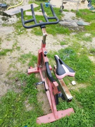 Bicicleta de spinning en color rojo, ideal para entrenamientos en casa. - Manillar ajustable. - Sillín acolchado. - Pedales con agarre. Funciona bien pero ahí que dar un repaso tiene oxido pero nada grave