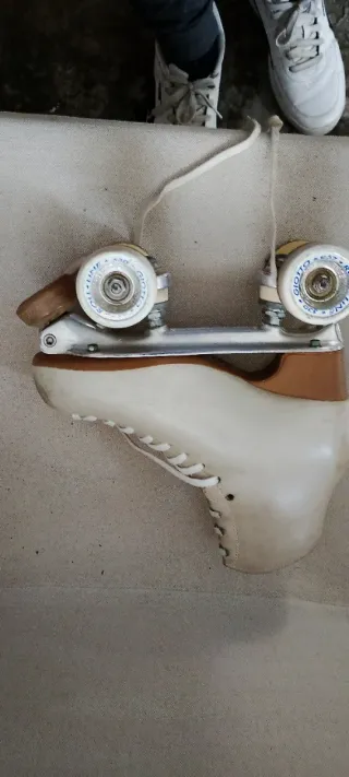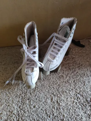 Patines blancos en talla 36. - Diseño alto tipo bota. - Cierre con cordones. - Ruedas de color beige. Se retira en alcoy