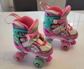 Se venden patines infantiles en buen estado, ideales para iniciarse en el patinaje. - Diseño en color rosa y blanco. - Decoración con flores. - Cierre de velcro y hebilla.