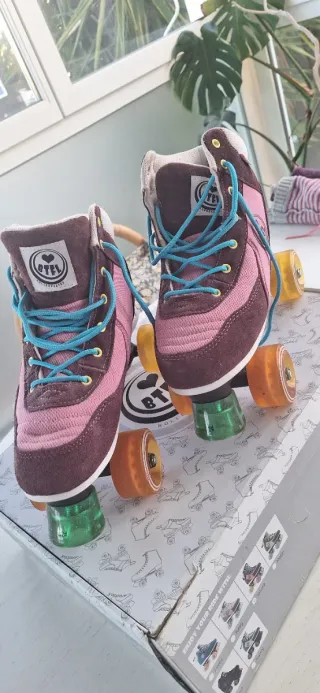 Patines de la marca btfl, modelo top. - Diseño en color rosa y marrón. - Cordones de color azul. - Ruedas verdes y naranjas.
