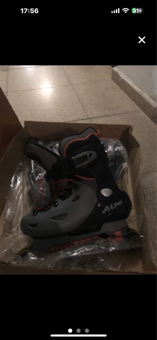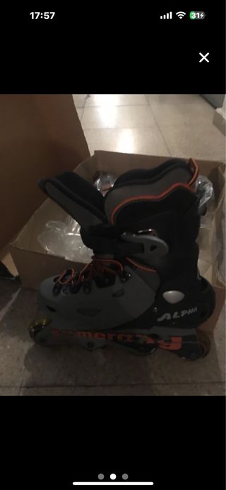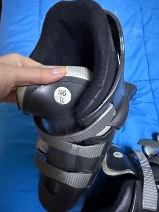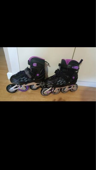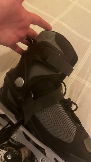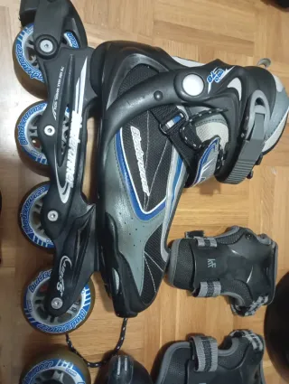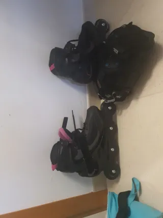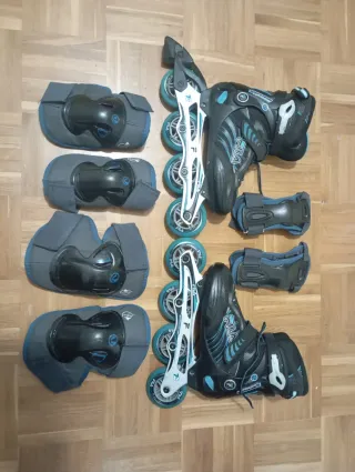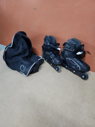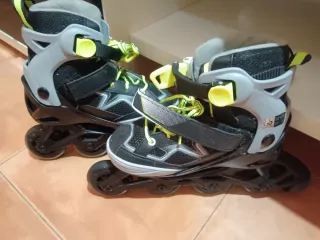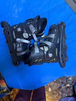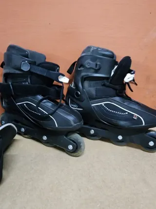 Vendo patines en línea de bota rígida en color negro con detalles en gris. Son ideales para quienes quieren empezar a patinar o para niños/adolescentes. • Talla: 36. • Estado: Usados pero bien conservados. Presentan los típicos roces estéticos en la bota plástica por el uso, pero los cierres y las ruedas funcionan perfectamente. • Características: • Bota rígida de bajo peso para mayor protección del tobillo. • Lengüeta acolchada para mayor comodidad. • Sistema de cierre mediante tres correas ajustables (hebillas de presión). • Incluye freno trasero en el patín derecho. • Extras: Se entregan en su caja original.