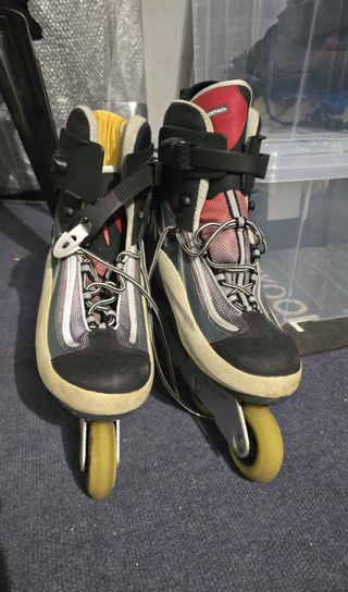 Patines en línea para hombre, diseñados para ofrecer comodidad y estilo. - Diseño deportivo con detalles en rojo y gris. - Cierre de velcro y cordones para un ajuste seguro. - Ruedas amarillas. - Botas resistentes y duraderas. Núm 45
