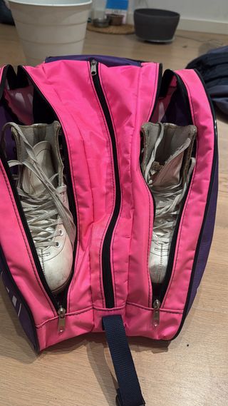 Mochila diseñada para transportar patines. Cuenta con un compartimento principal y bolsillos exteriores. - Color morado y rosa. - Cierre de cremallera. - Correa ajustable con hebilla.