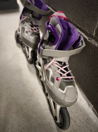 Patines en línea para niña en color lila 🟣 y gris 🩶 Diseñados para ofrecer comodidad y estilo. - Cierre de velcro y cordones. - Ruedas resistentes. - Talla 32-35