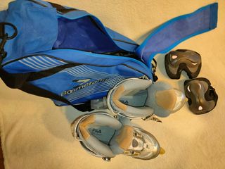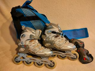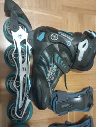 Set de patines en línea marca Fila, talla 39. Incluye protecciones para codos Incluye bolsa de transporte azul
