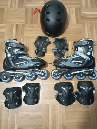 Set completo de patines en línea con protecciones. - Incluye casco negro. - Dos patines en línea, talla ajustable. - Juego de rodilleras y coderas. - Muñequeras.