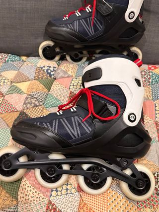 Patines en línea de estructura rígida. - Talla: 41/42 - Marca Oxelo. - Triple sistema de ajuste (2 hebillas micrométricas + cordón) - Ruedas de patinaje en línea. Tiene literalmente 1 sólo uso.