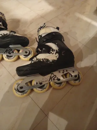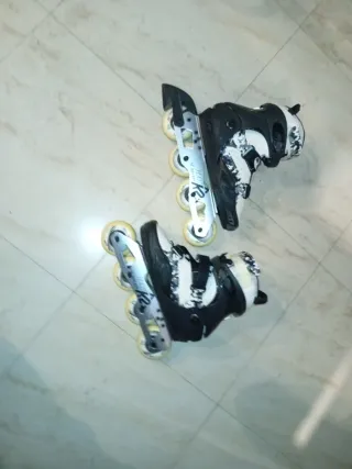 Se venden patines en línea con un diseño moderno en blanco y negro. - Ruedas de alta calidad. - Marco metálico resistente. - Cierre seguro para mayor estabilidad.
