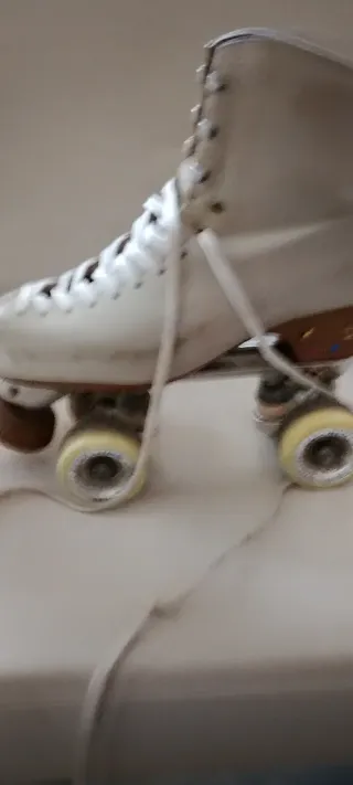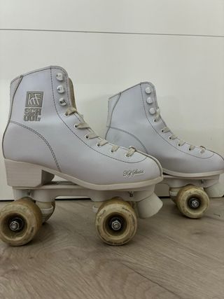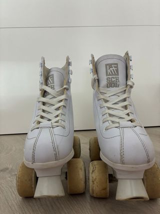 Par de patines blancos, listos para usarse. - Diseño clásico con cordones. - Ruedas para patinaje. - Talla 37