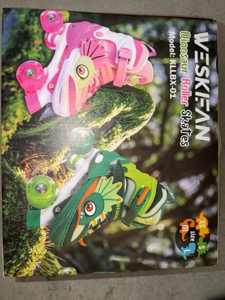 Patines de cuatro ruedas ajustables para niño. - Diseño de dinosaurio. - Ruedas luminosas. - Ideales para principiantes.