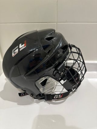 Casco de hockey sobre patines en color negro. - Marca GL. - Diseño con rejilla protectora. - Cierre de correas.