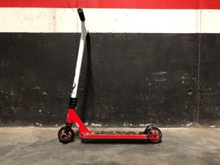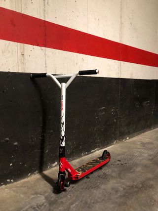 Patineta de dos ruedas con manillar. - Manillar con empuñaduras naranjas. - Plataformas naranjas para los pies. - Estructura negra y detalles naranjas. Tiene el manillar dañado pero fin bien