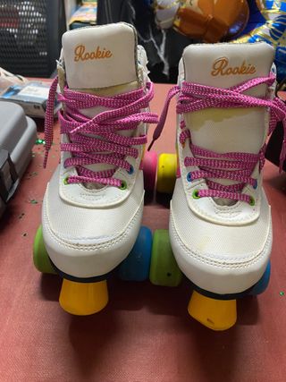 Patines de la marca Rookie en color blanco con cordones rosas. - Diseño juvenil y llamativo. - Ruedas de colores. - Cierre con cordones.