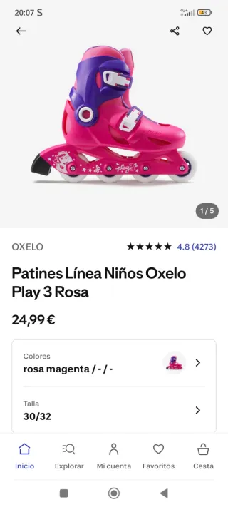 Patines de cuatro ruedas de la marca Oxelo en color rosa, talla 31. Perfectos para iniciarse en el patinaje. Actualmente ya no se fabrica este modelo en color rosa y se venden en tienda por 50 € (ver última foto) Ver más características del patín Modelo 8494830 en en la web de Decatlón.