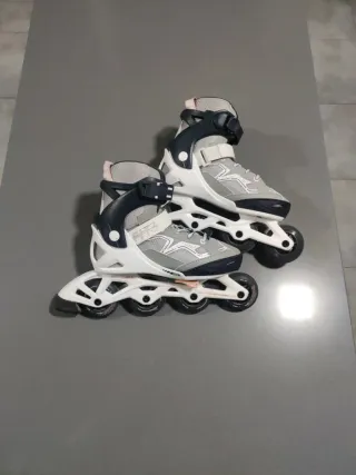 Patines en línea para patinaje recreativo. - Talla ajustable de 35 a 38. - Diseño moderno en gris y blanco. - Cierre de velcro y hebilla para mayor seguridad.