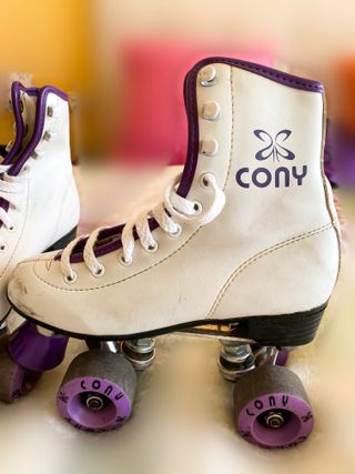 Patines de 4 ruedas y freno, marca Cony talla 8 1/2 (240mm largo de bota, color blanco y morado, en su bolsa original. Usados con roces y desgaste pero en buen estado.