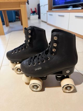 Patines quad polivalentes ideales para iniciarse en el patinaje o para uso ocasional. Muy cómodos, con diseño tipo zapatilla deportiva y estilo vintage. Talla EU 36 Muy buen estado, usados solo en 3 ocasiones. Precio original en decathlon 49.99 **Características técnicas:** * Bota de PU sintético * Freno de poliuretano (no deja marcas) * Chasis y trucks de PP de alto impacto * Ruedas de PU inyectado * Cumplen la norma europea de seguridad EN 13899
