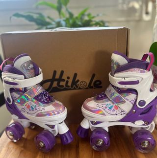 Patines de cuatro ruedas para niña, marca HIKOLE, en excelente estado, casi nuevos. Diseñados para ofrecer diversión y estilo. - Diseño en color blanco y morado con detalles holográficos. - Ruedas con luces que se activan al rodar. - Cierre de velcro y cordones para un ajuste seguro. - Talla ajustable para adaptarse al crecimiento. Número 27-30