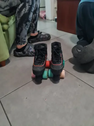 Se venden patines de cuatro ruedas en color negro. - Cierre con cordones y velcro. - Ruedas de colores (naranja, morado, verde). - Diseño alto tipo bota. Número 39