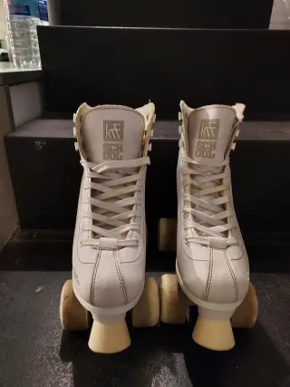 Patines de cuatro ruedas con un diseño retro y urbano. Perfectos para disfrutar de paseos. Usados 1 hora😅. - Talla 41/8. - Diseño en color blanco sucio con detalles en burdeos. - Cordones a juego. - Ruedas de color marrón. - Ligero desperfecto en talón del patín derecho, y puntera patín izquierdo, no por uso, sino por estar guardado.
