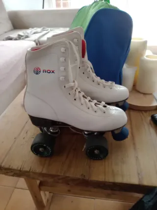 Se venden patines blancos de la marca ROX con cuatro ruedas. Perfectos para disfrutar del patinaje. - Diseño alto y clásico. - Cierre con cordones. - Ruedas de color negro.