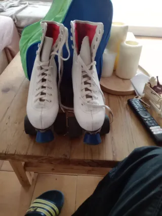 Se venden patines de cuatro ruedas en color blanco profesionales marca digne .Son cómodos y perfectos para competir - Ruedas de colores: rosa, azul y beige. - Cordones blancos. - Bota alta. costo 160€ usados solo 4 clases a toda prueba talla 32 se puede reducir el número con una plantilla