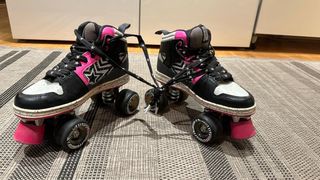 Patines de ruedas estilo quad en talla 39. Diseñados con un estilo moderno y llamativo. - Color principal negro con detalles en fucsia y blanco. - Cordones negros con estampado de estrellas. - Freno de color rosa y ruedas negras sin apenas uso MARCA OXELO (Decathlon) En tienda cuestan 55€ - Se entregan con un par de muñequeras de la misma marca