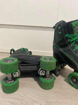 Se venden patines de cuatro ruedas en color negro con detalles en verde. - Diseño alto tipo bota. - Cordones verdes. - Ruedas verdes.