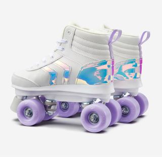Patines de 4 ruedas para niña, talla 30. - Diseño alto tipo bota. - Ruedas de color lila. - Detalles iridiscentes en los laterales. - Cierre con cordones blancos. - Tiradores traseros para facilitar su colocación.