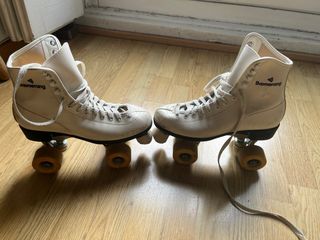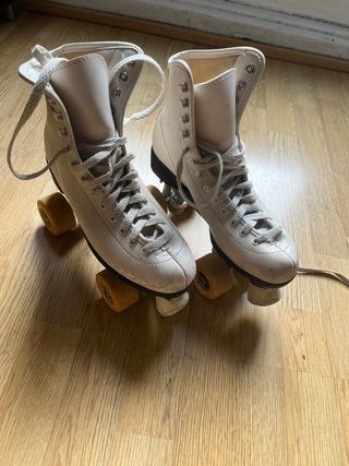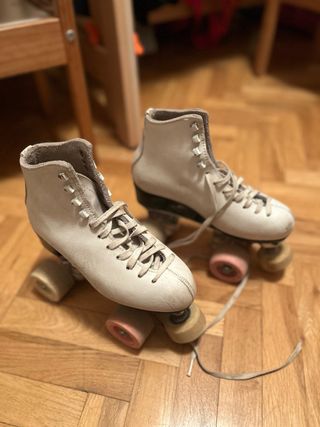 Patines artísticos blancos de cuatro ruedas en buen estado. - Diseño clásico y elegante. - Cordones resistentes para un ajuste seguro. - Ruedas y freno nada desgastados