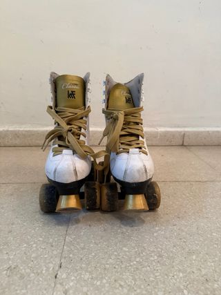 Patines clásicos de cuatro ruedas en color blanco y dorado. Perfectos para iniciarse en el patinaje. - Talla 36. - Diseño de caña alta. - Cordones dorados. - Ruedas doradas - Regalo bolsa y sobre patín