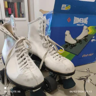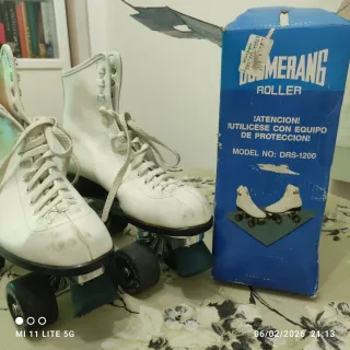 Patines de cuatro ruedas de la marca Boomerang en color blanco.T-39 - Diseño clásico de bota alta. - Cordones blancos. - Ruedas amarillas. *un freno delantero esta algo desgastado,se encuentran en muy buen estado pero con algun arañazo en la parte delantera.