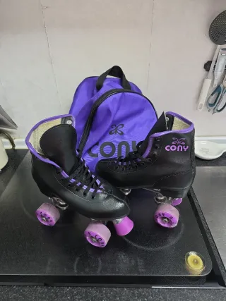 Se venden patines de 4 ruedas en color negro con detalles morados. Incluyen bolsa de transporte. Talla 38. - Diseño clásico. - Cordones negros. - Ruedas moradas. - Bolsa de transporte morada.