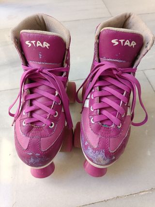 -Patines de cuatro ruedas aspecto vintage en color rosa. -Talla 38. -Cordones blancos. - Ruedas y freno de goma para patinar sin derrapar y frenar eficazmente. -Botín forrado de espuma para mayor comodidad al patinar. -Usados 2 veces.