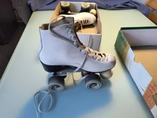 Se venden patines de cuatro ruedas en color blanco. Talla 37. Perfectos para iniciarse en el patinaje. - Diseño clásico y elegante. - Cierre con cordones para un ajuste seguro. - Ruedas resistentes para un deslizamiento suave. - Se incluye bolsa transporte y funda patines