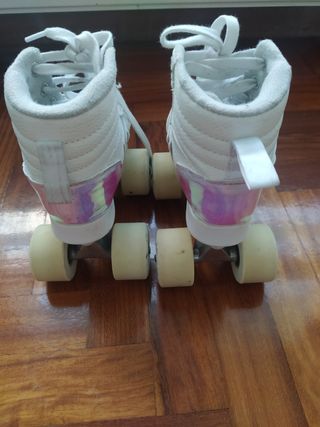 Patines de cuatro ruedas en color blanco, talla 36. Presentan un diseño moderno con detalles iridiscentes. Como nuevos, se usaron una tarde. - Cierre con cordones blancos. - Detalle lateral iridiscente en tonos azules y rosas. - Ruedas de color lila.