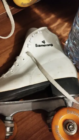 Patines de cuatro ruedas marca Boomerang en color blanco. Perfectos para iniciarse en el patinaje. Talla 40. Están usados 8/10 veces. Tienen algún roce que se ve en las fotos pero están perfectamente conservados. Su precio en tienda nuevos es de 120€. - Diseño clásico de bota alta. - Cordones negros. - Ruedas resistentes. - frenos perfectos casi sin usar