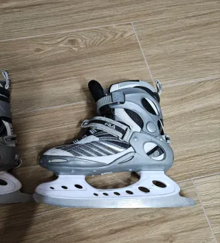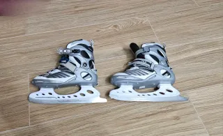 Patines de hielo ajustables, diseñados para ofrecer comodidad y soporte. - Color gris claro con detalles en azul. - Cierre de hebilla y velcro. - Material exterior de plástico resistente. - Interior acolchado para mayor confort.
